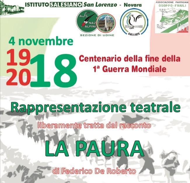 La Sezione di Udine dell’Associazione Nazionale Alpini, in collaborazione con l’Associazione Partigiani Osoppo, l’Istituto Salesiano San Lorenzo di Novara e la Cooperativa Verde Azzurra di Galliate, organizzano la rappresentazione teatrale LA PAURA, liberamente tratta dall’omonima novella dello scrittore catanese Federico De Roberto, e che viene considerata uno dei vertici del racconto italiano dell’intero XX secolo.