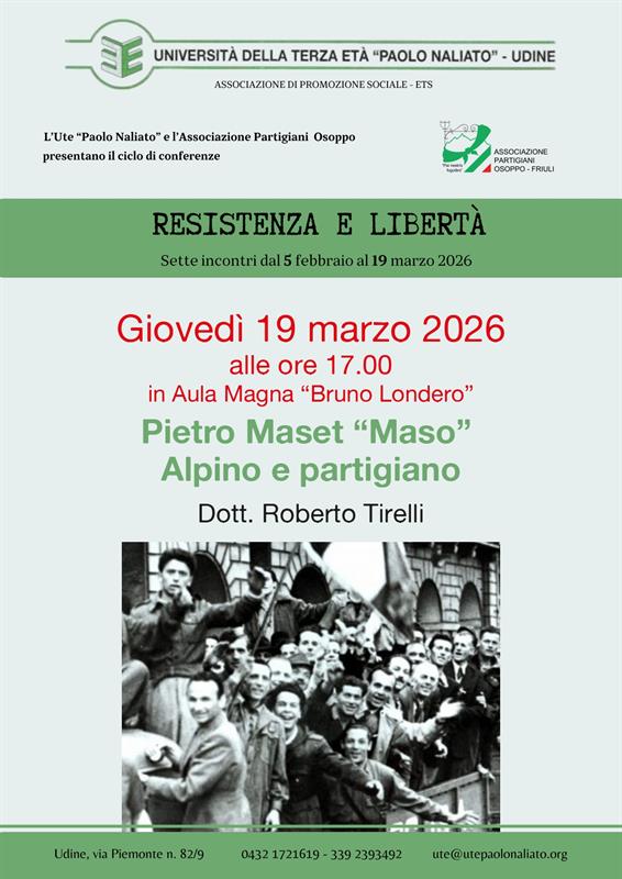 Giovedì 19 marzo alle ore 17:00 presso l'Aula Magna della Università della Terza Età "Paolo Naliato” si terrà la settima (e ultima) conferenza del ciclo "RESISTENZA E LIBERTA’” dal titolo “PIETRO MASET “MASO” - ALPINO E PARTIGIANO”. L'incontro sarà tenuto da Roberto Tirelli, autore di numerose pubblicazioni dell’APO, che racconterà la straordinaria figura della M.O.V.M. Pietro Maset, “Maso”.